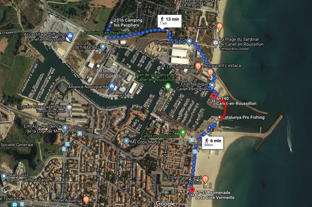 The owner / manageress of a ladies' hairdressers took me into Canet Plage itself. She asked on my behalf if any of the staff or customers had heard of Club 18-30 but no one had. I thanked them for their trouble and walked to the tourist office who gave me the names and addresses of three campsites which did business with British holiday companies and a map to aid their location. One was in Canet Sud, the others were in the port end of town. I walked to the port, then inland along the river to the first bridge and back to the beach. I asked at the campsites for Club 18-30, but again, no one had heard of them.