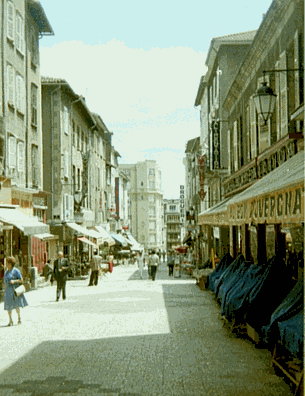 We stopped for drinks at about ten, having parked in rue Jacob. We walked round the St Germain district for a while. During our search for a cafe with vacant seats, we watched a youth performing mime, whilst his friend played a guitar. , And a corner outside Aux Deux Magots was occupied by a crowd watching a fire eater juggling with flaming skittles whilst balancing on a slack rope six feet in the air strung between two trees.