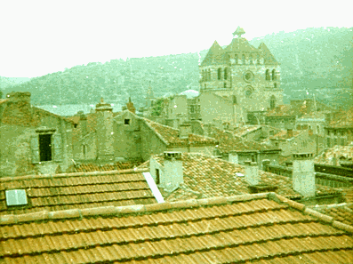 I woke not long after ten, and admired the beautiful view over the rooftops towards Jean-Paul's flat, the cathedral, and the causse beyond the river Lot. From a flat below our third floor window, rose the sound of accordion music. "The Birdie Song" was one of the tunes being played, but somehow it was not as nauseating as usual, probably because there were no idiots waving their hands in the air vaguely in time with the music. The weather tried to rain slightly that morning, but quickly dried up, a useful shower that served to keep the dust down.
